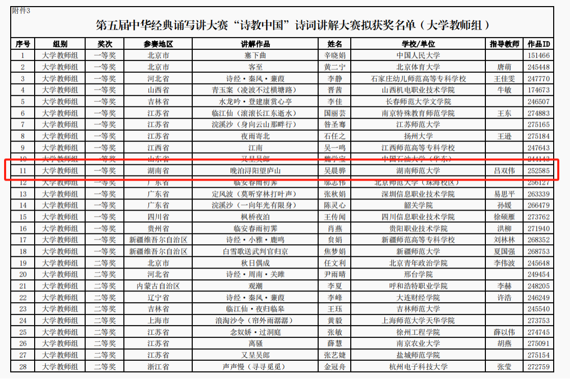 (教务办供稿)近日,第五届中华经典诵写讲大赛“迦陵杯•诗教中国”诗词讲解大赛公布获奖名单,beat365体育官网教师吴晨骅在吕双伟副院长的指导下参赛,并以其讲解作品《晚泊浔阳望庐山》获全国大学教师组一等奖。